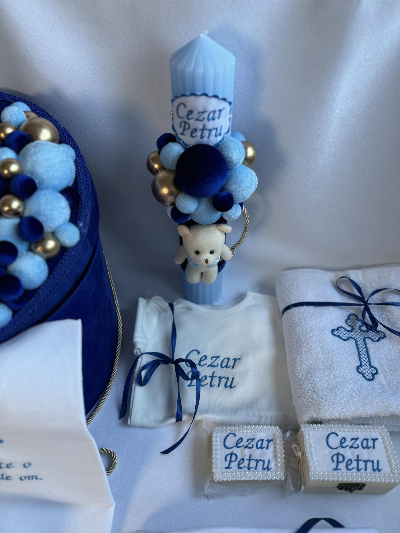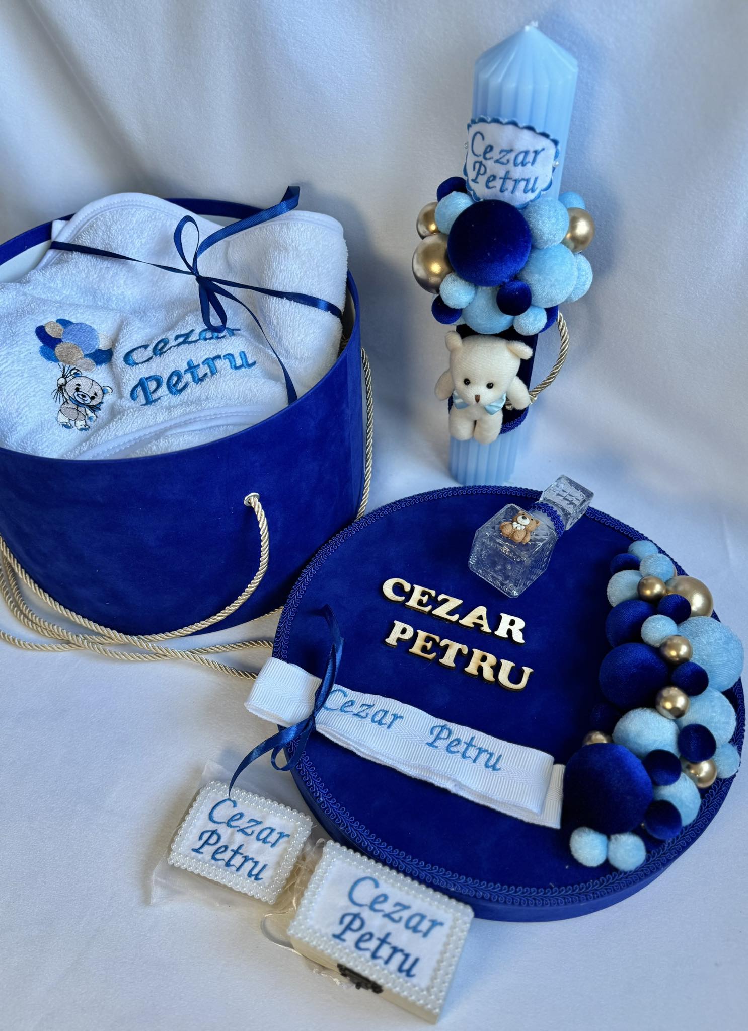 Setul include o lumânare de botez 🕯️ lucrată manual, cu dimensiunea de 35 × 6 cm, personalizată pentru a completa perfect ceremonia. Trusoul este însoțit de o cutie rotundă elegantă 🎁✨, îmbrăcată în catifea, disponibilă în dimensiuni între 19 și 31 cm, decorată manual și adaptată cromatic și stilistic tematicii alese.